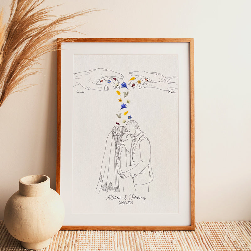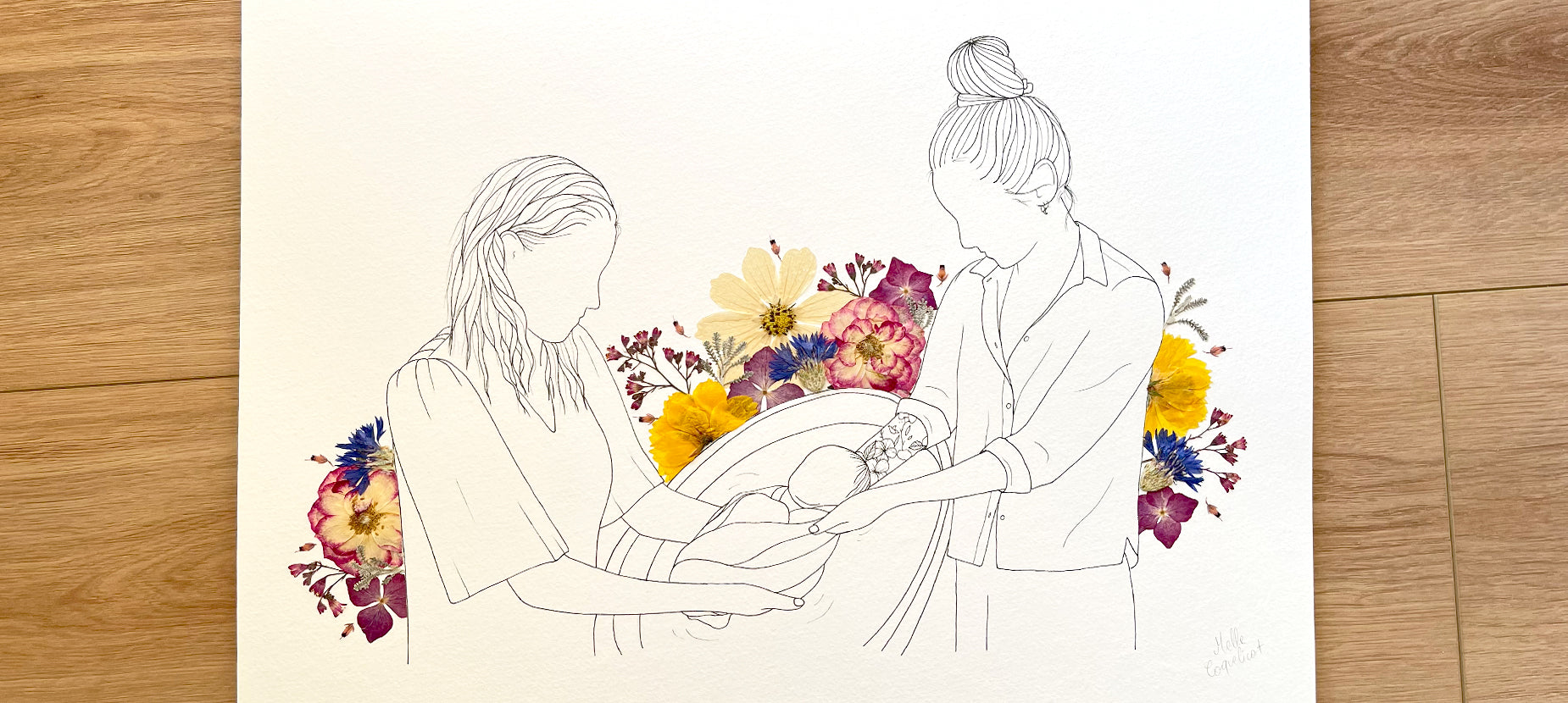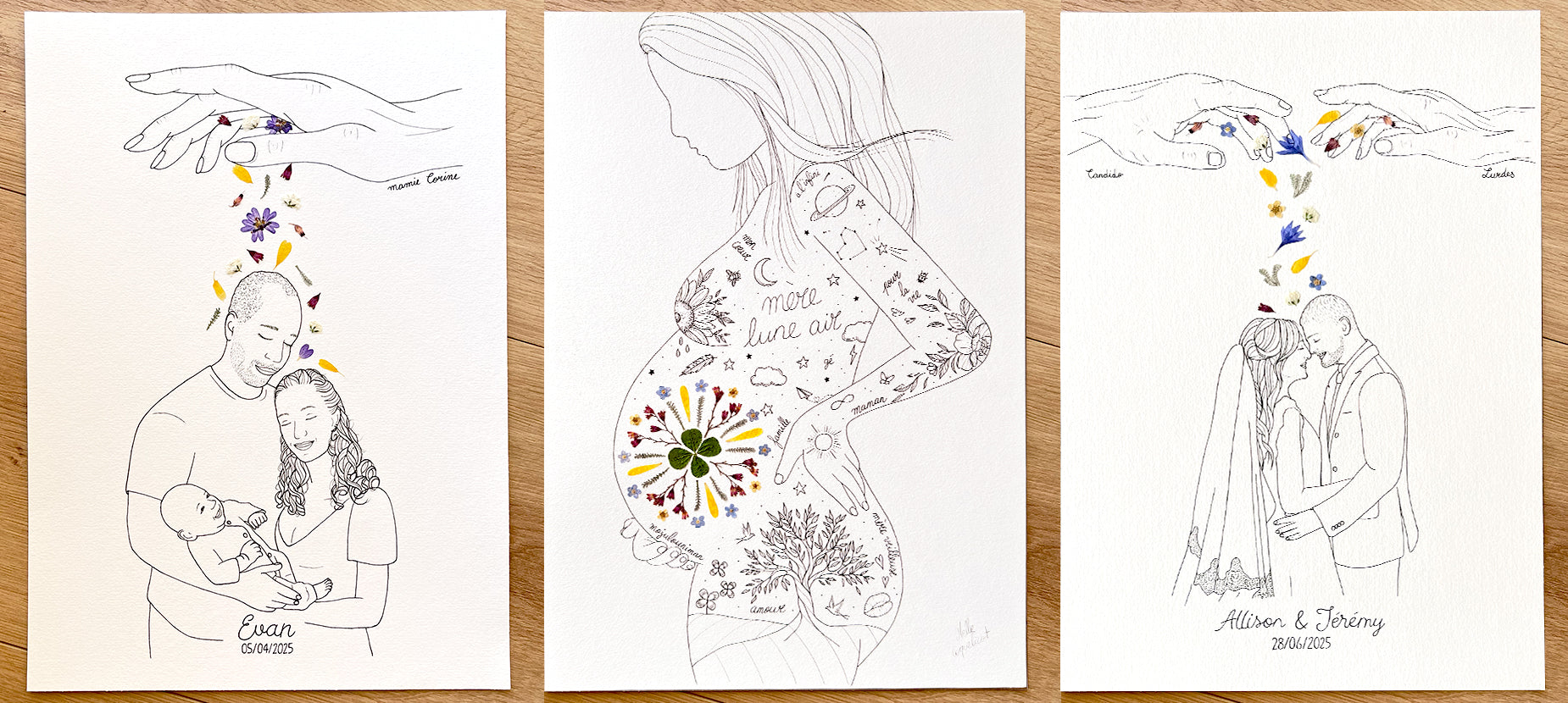 Pour un événement spécial, une décoration d'intérieur unique ou pour un cadeau profondément personnel, nous concevons ensemble une œuvre qui vous ressemble, mêlant illustrations et fleurs pressées.