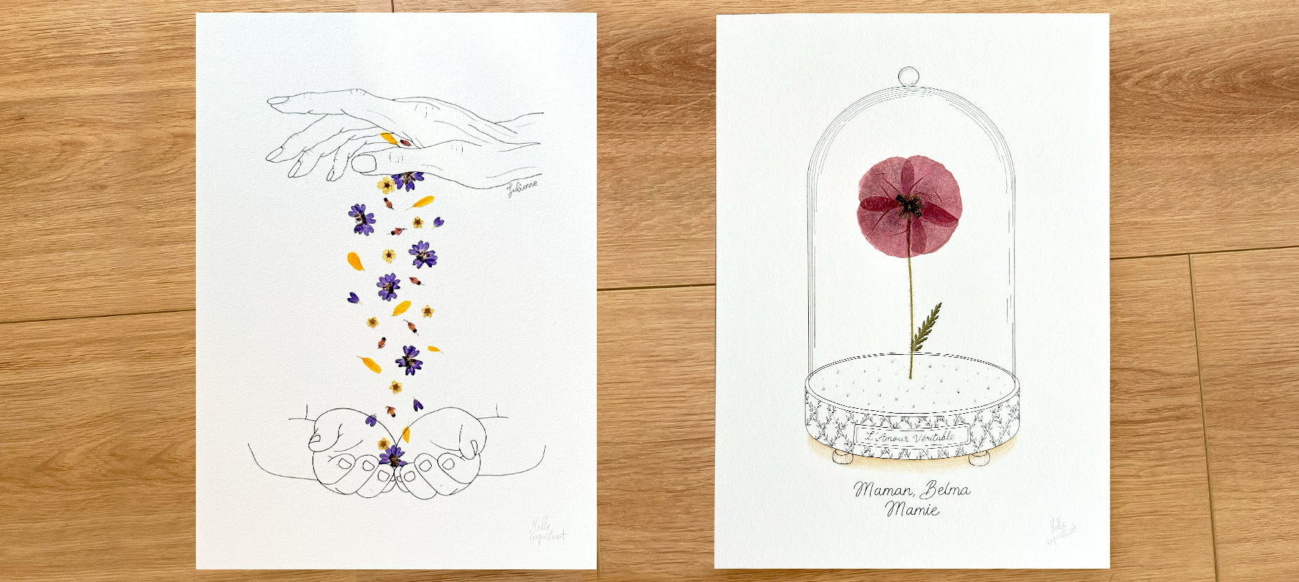 je compose votre œuvre en alliant fleurs pressées et illustration pour créer une harmonie unique.