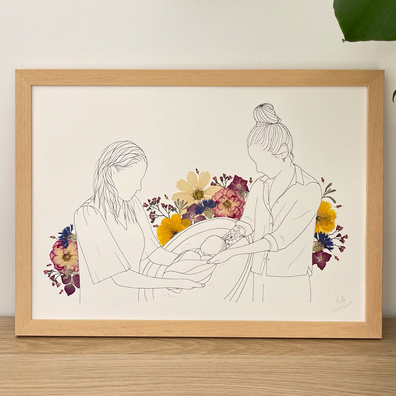 Réalisation : Illustration évoquant les deux personnes + intégration de fleurs représentant leur lien unique.